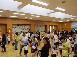 ホールでおうちの人と一緒に、体を動かして楽しく遊びました。