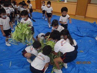 5歳児のこどもたちがとうもろこしの皮むきをしました。