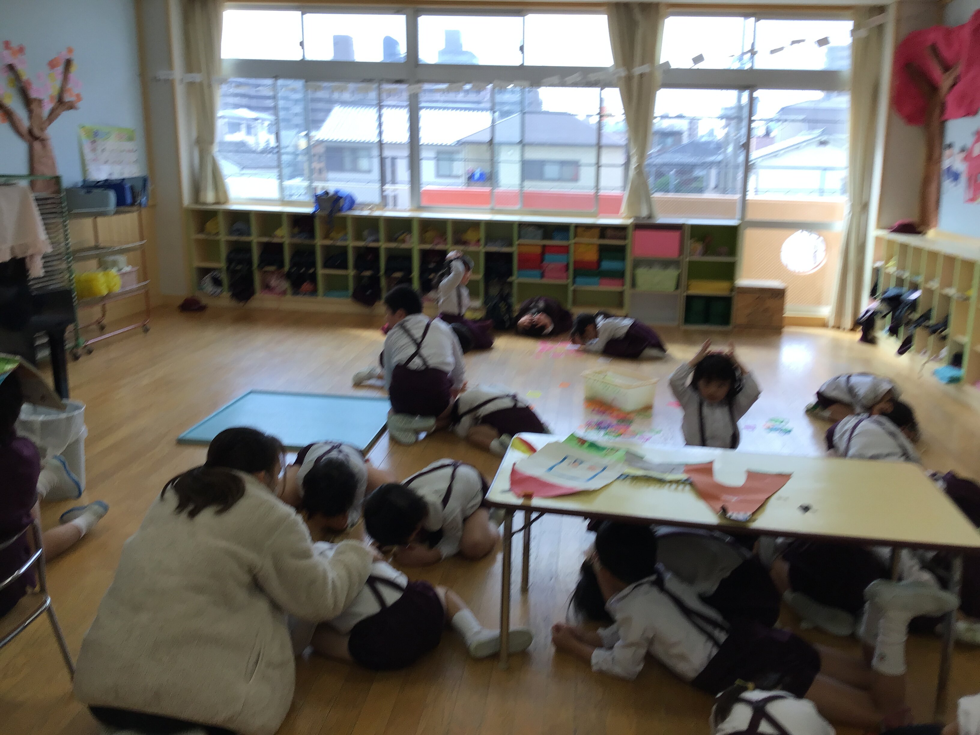 次の放送が流れると防災頭巾を被り、園庭に避難します。