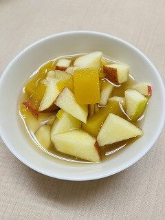 オレンジジュースに寒天とお砂糖を加え、バナナ、りんごと合わせたフルーツポンチ。暑くなってきたこの時期には冷たい果物が美味しいね。