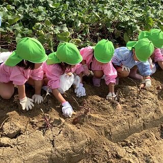 10月2日(水)、青空の下3歳児が幼稚園バスに乗って、お芋ほりに行きました。